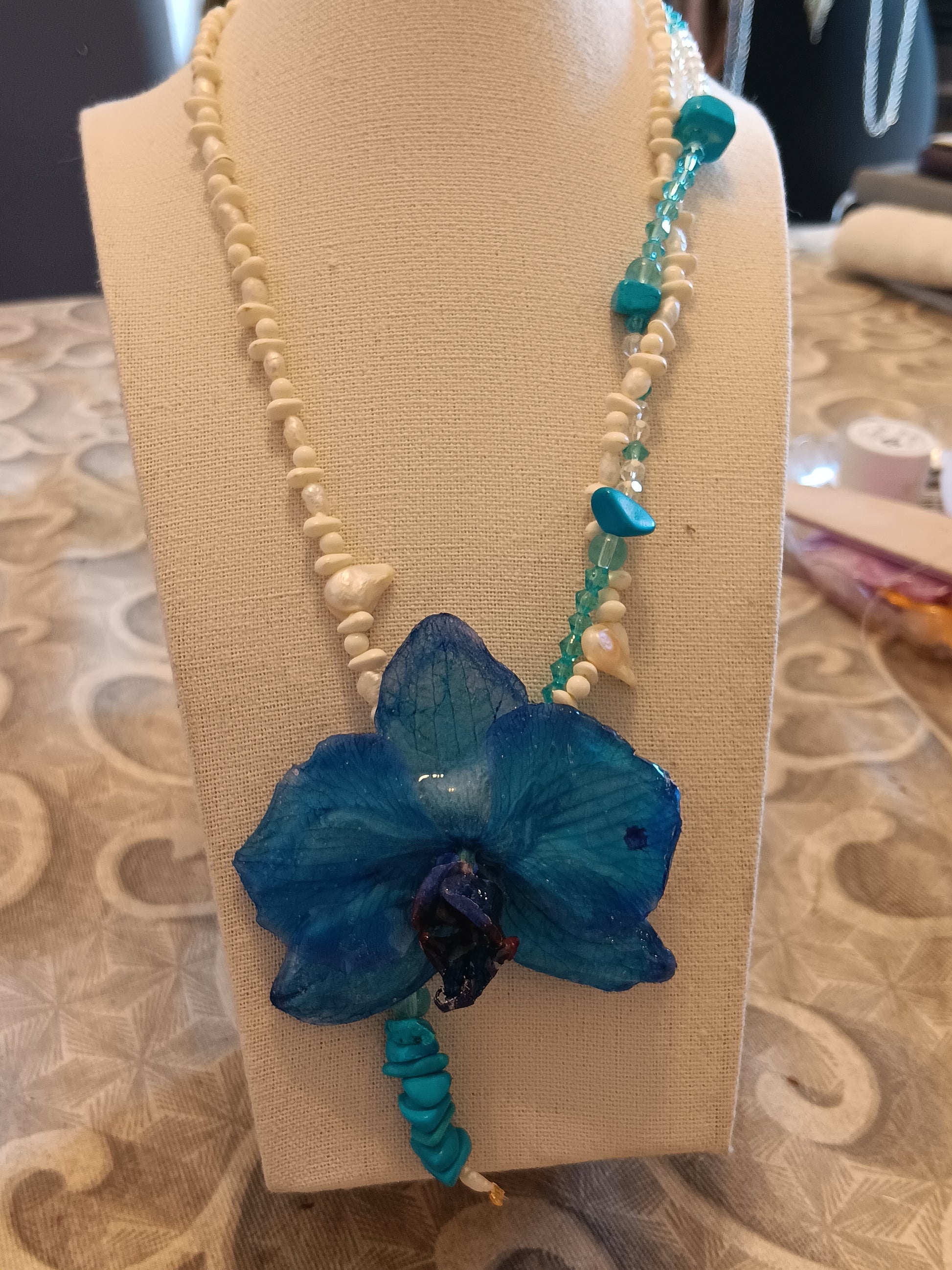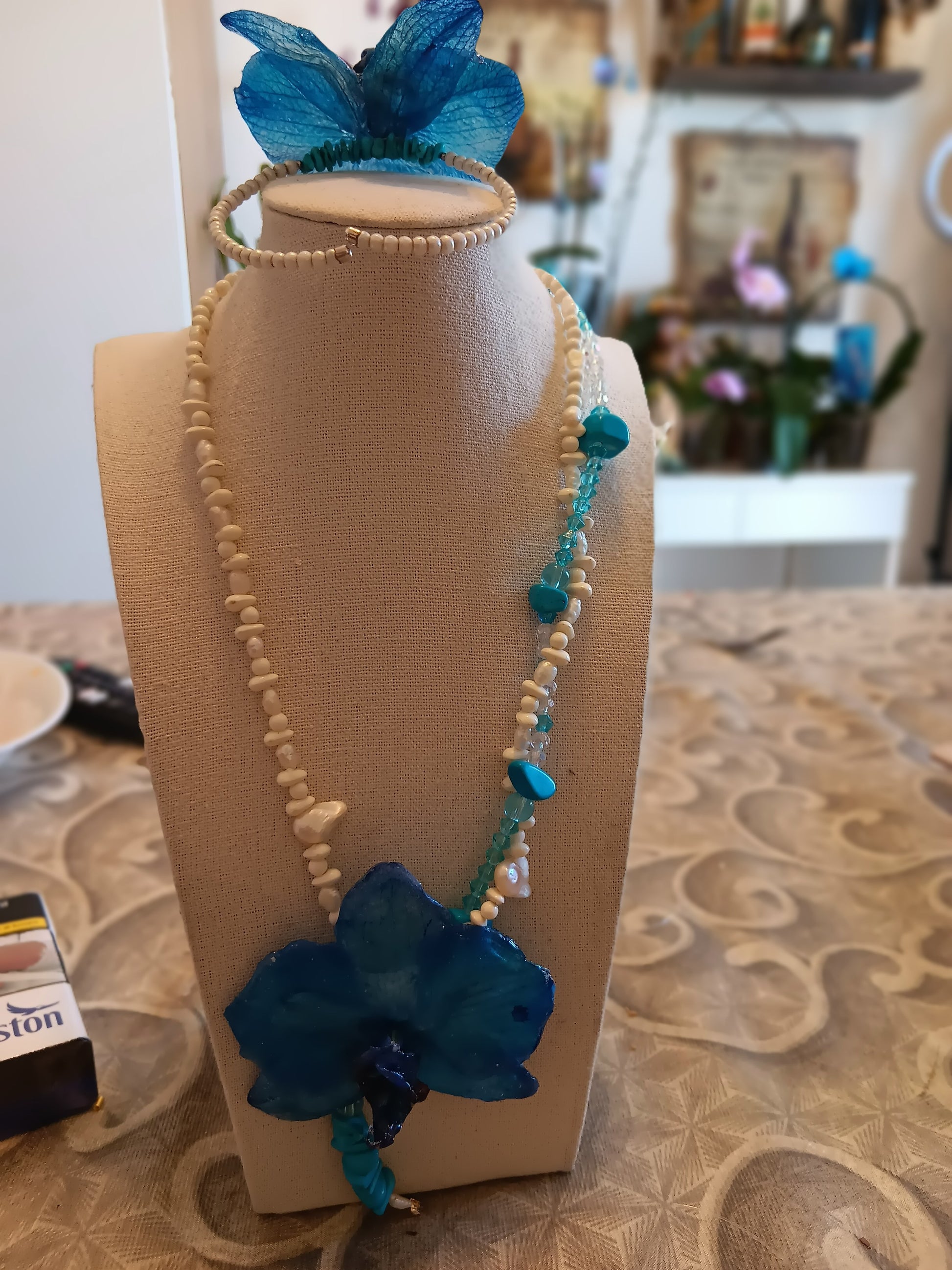 Orquidea blu lavorata con la resina e perle di acqua dolce