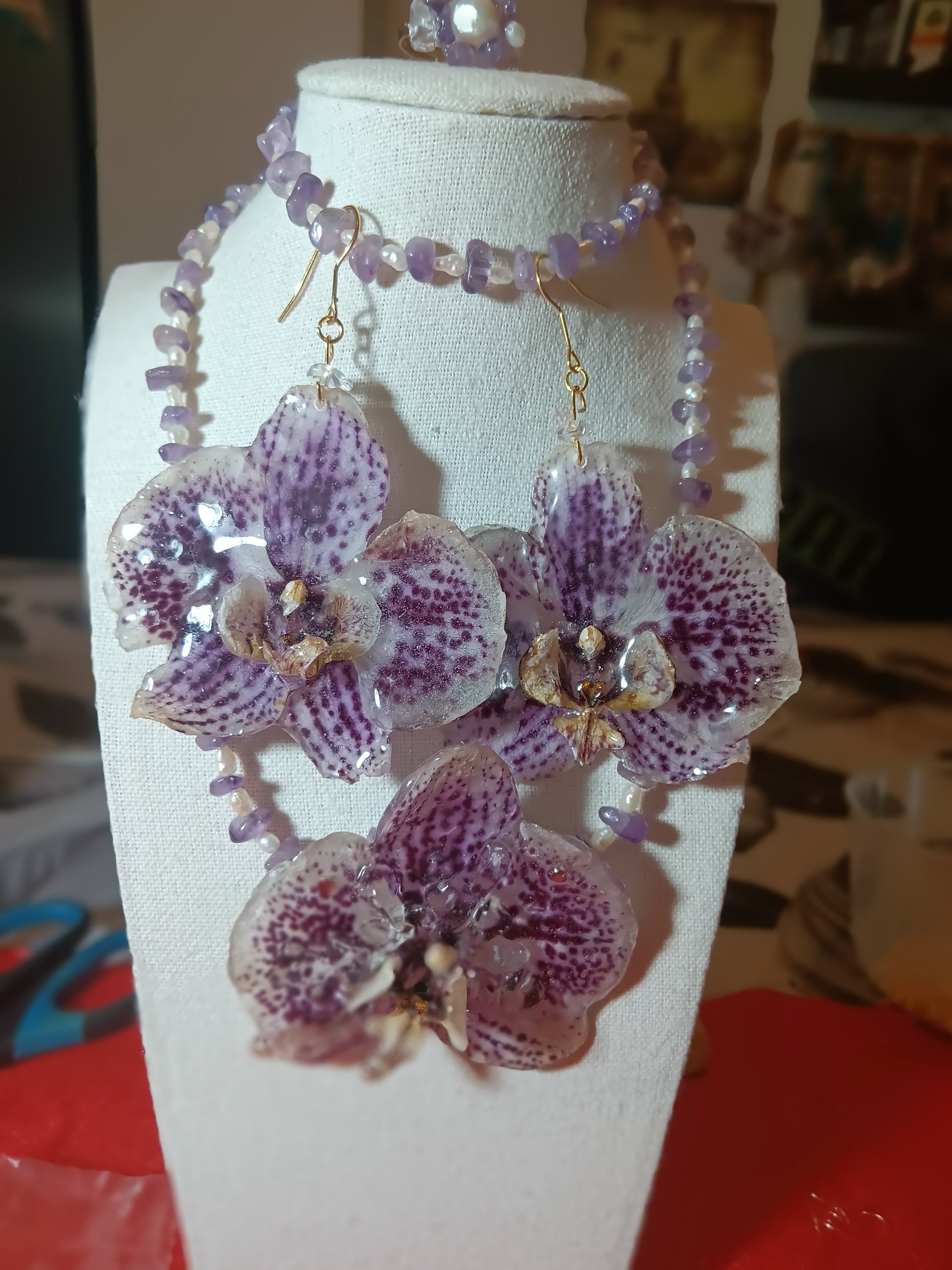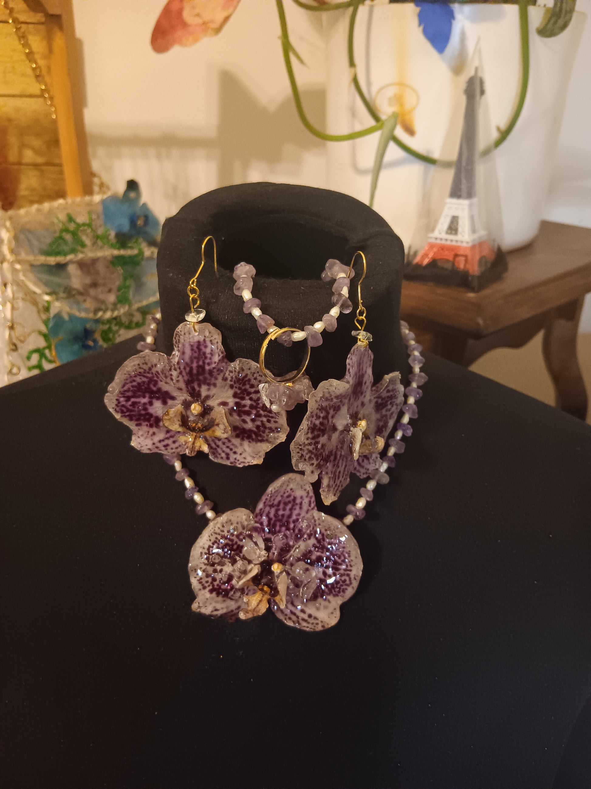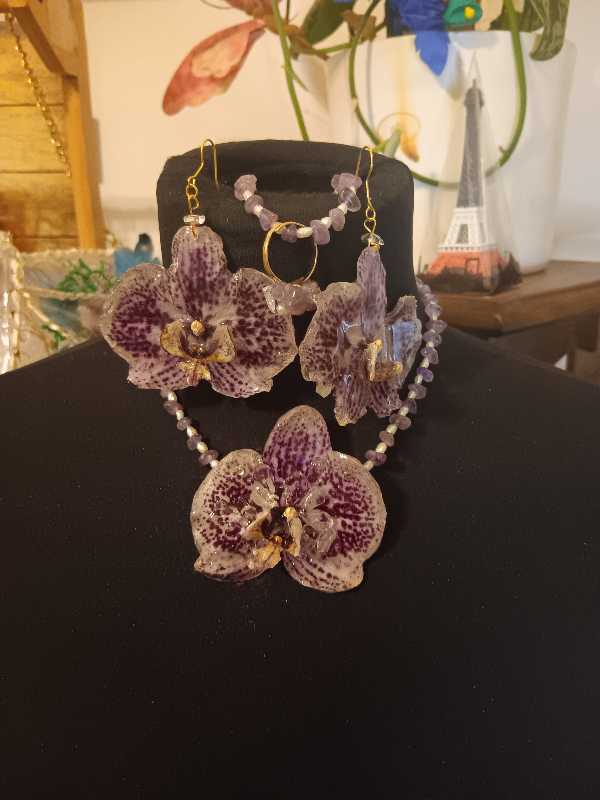 Collana orecchini, bracciale e anello di orchidea naturale e perla di fiume e ametista